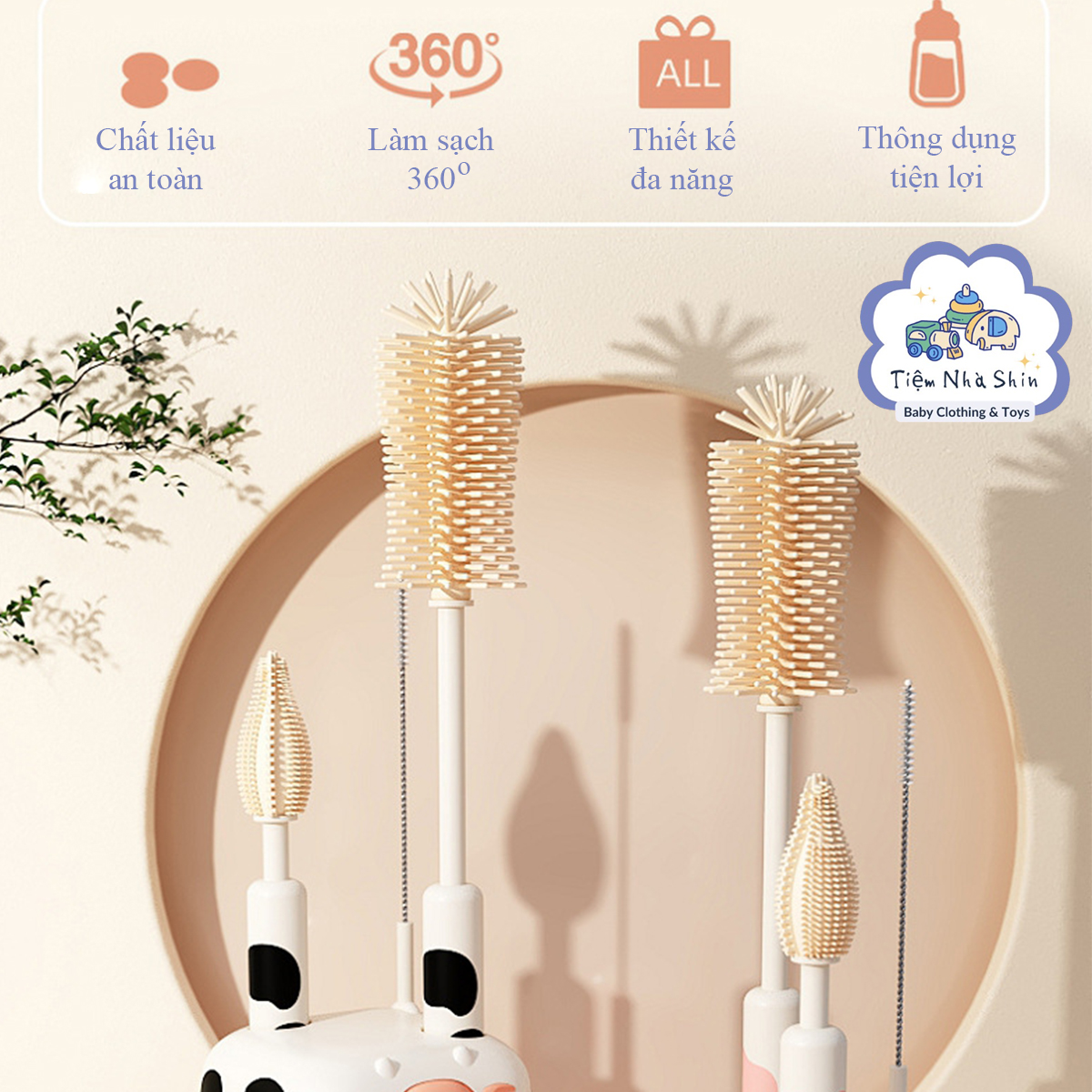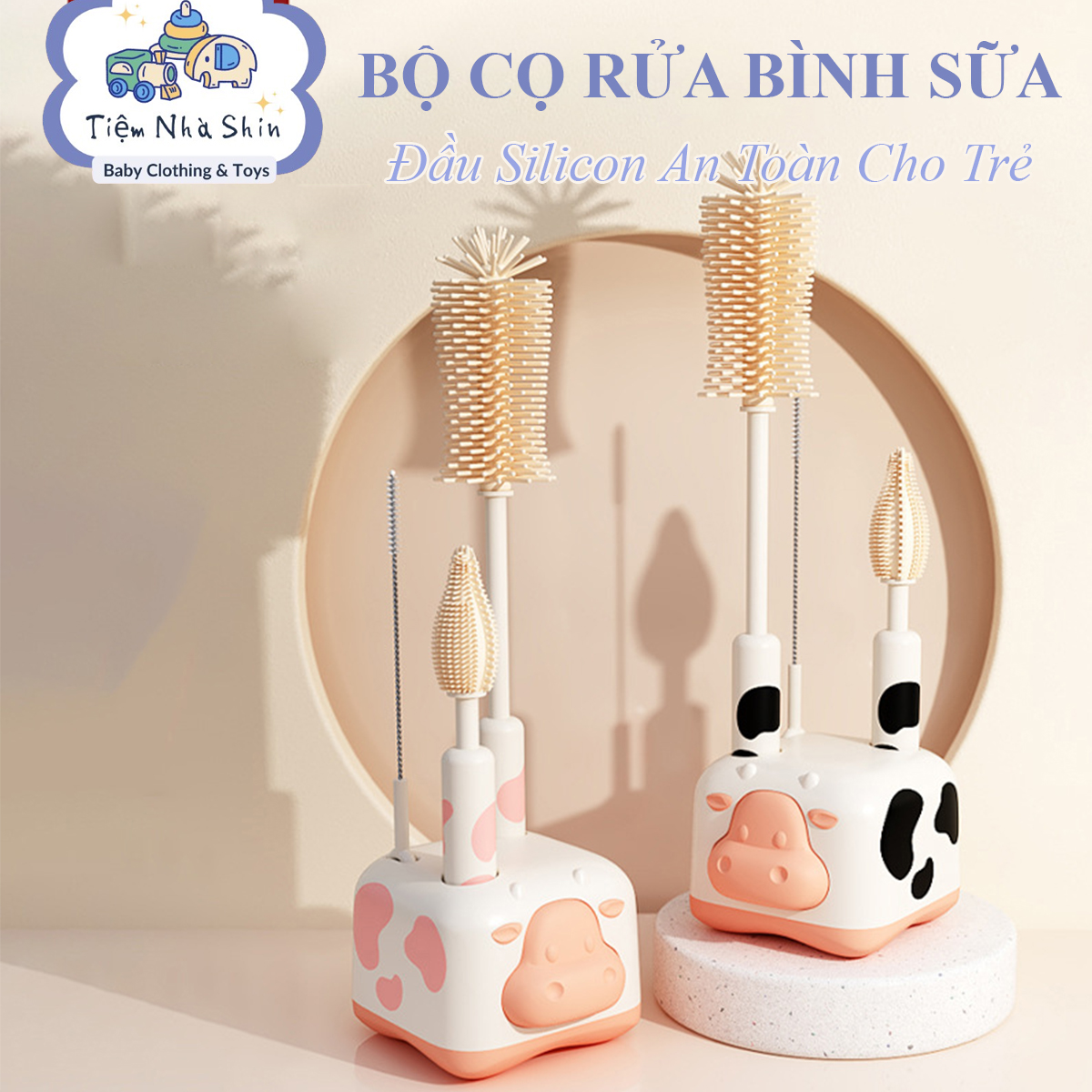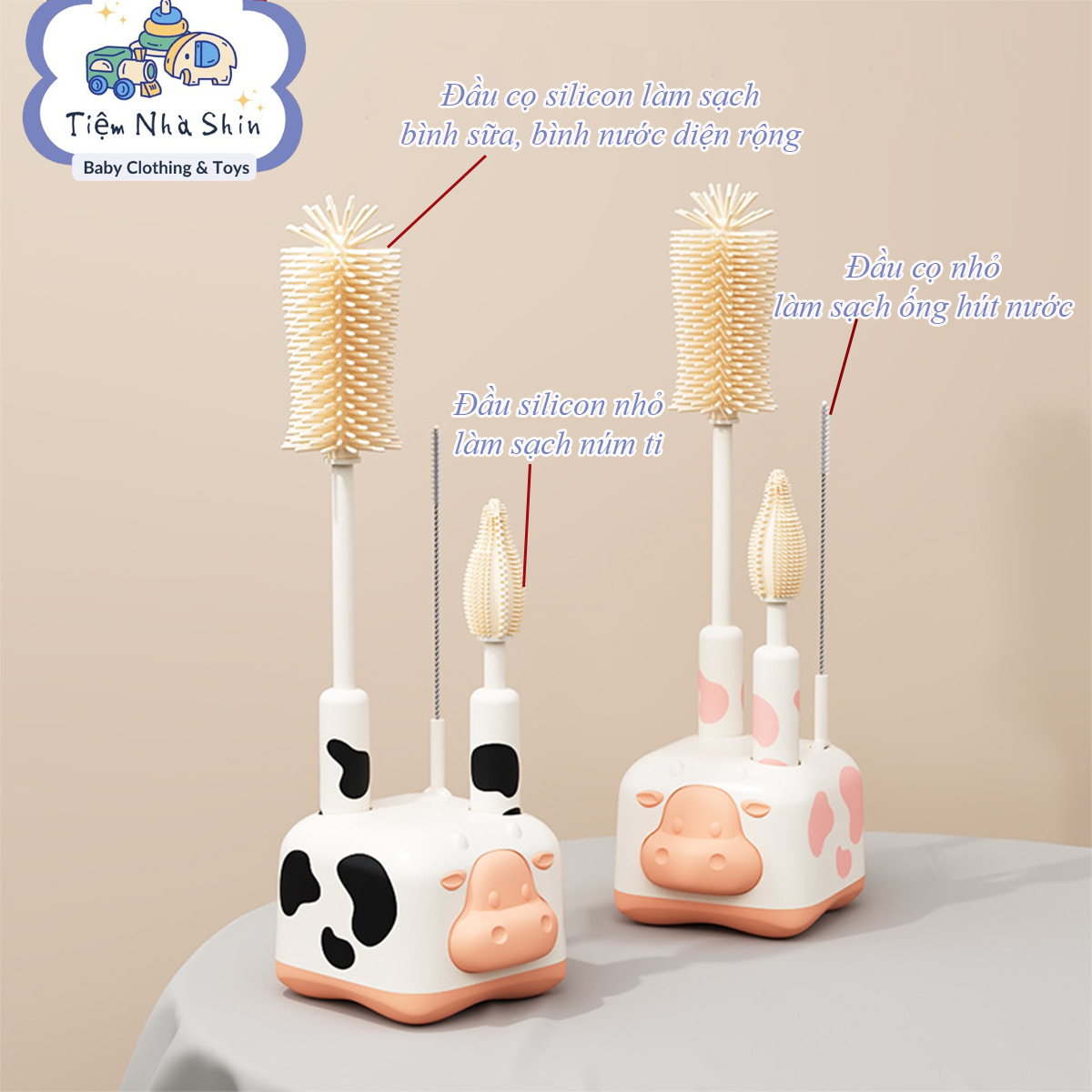 Bộ cọ rửa bình sữa họa tiết bò sữa bằng silicon, thiết kế cầm tay, chuyên dùng để vệ sinh bình sữa, núm ti và ống hút cho bé.