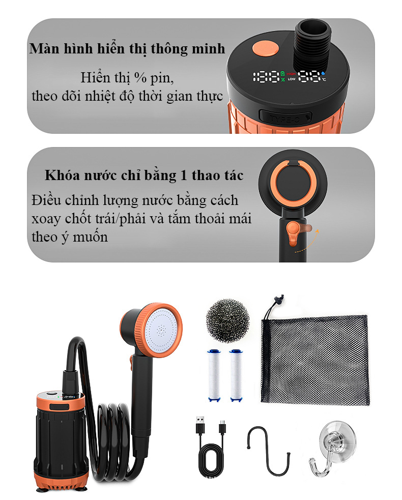 Điểm mạnh của mẫu này là thiết kế di động, không cần lắp đặt cố định, chỉ cần chuẩn bị nguồn nước phù hợp là có thể sử dụng nhanh. Sản phẩm tích hợp pin 8000mAh, cho thời gian dùng tham khảo khoảng 1,5 giờ ở mức cao và lên tới khoảng 3 giờ ở mức thấp, khá phù hợp cho nhu cầu tắm nhanh khi đi dã ngoại, cắm trại, rửa chân tay, vệ sinh đồ dùng hoặc dùng trong các chuyến đi ngắn. Phần đầu sen cầm tay giúp thao tác linh hoạt hơn, dễ sử dụng hơn nhiều so với các kiểu tắm tạm thông thường.