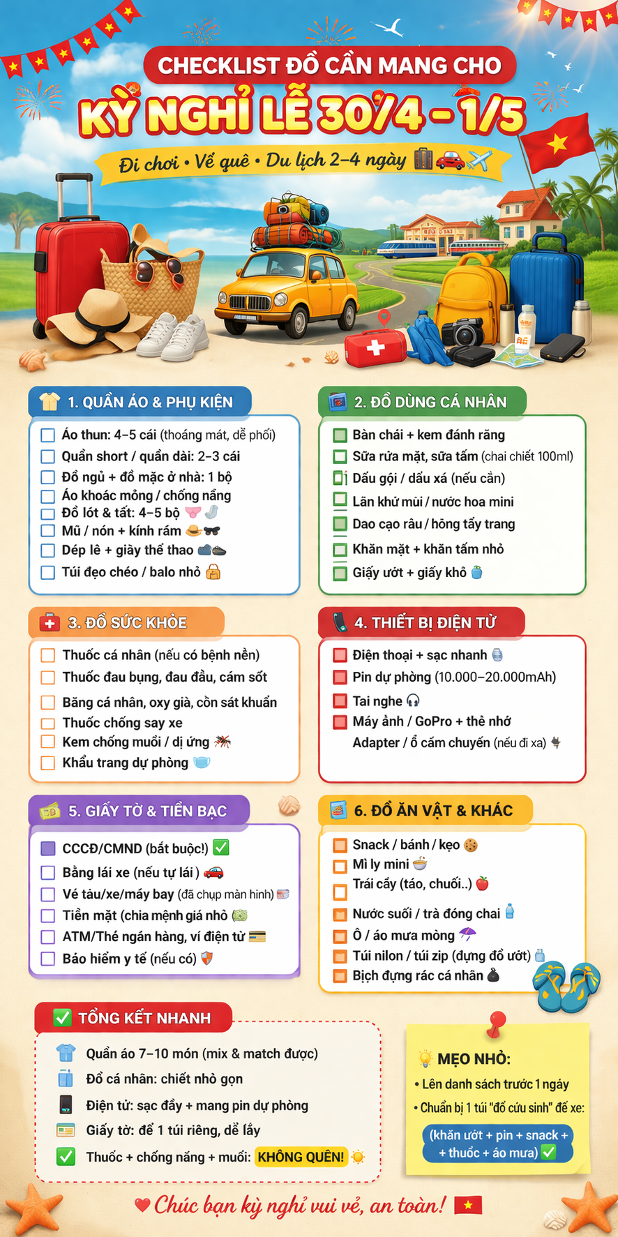 Checklist đồ cần mang cho kỳ nghỉ 30/4 để đi 3 ngày 2 đêm gọn mà không thiếu