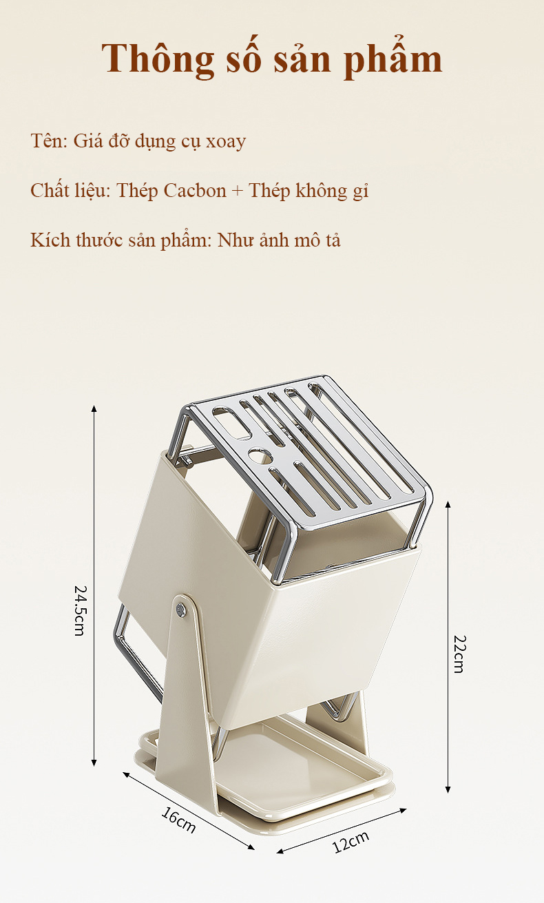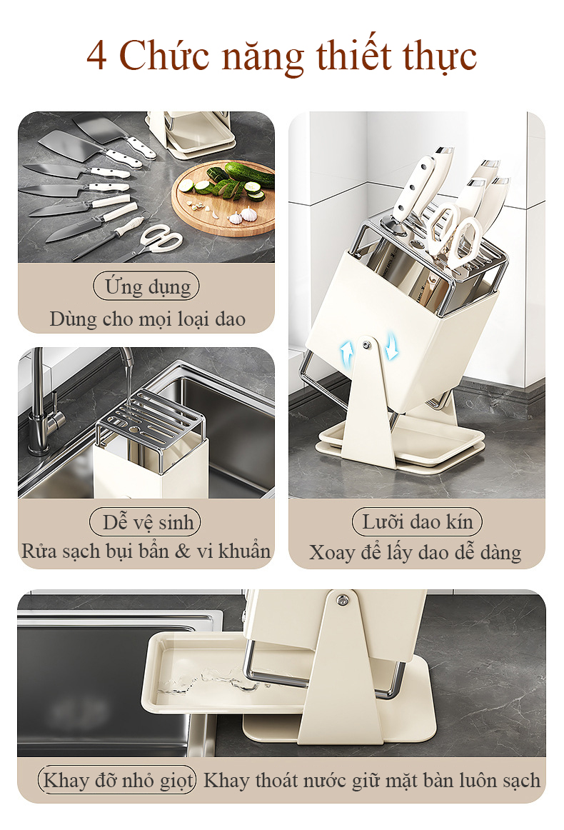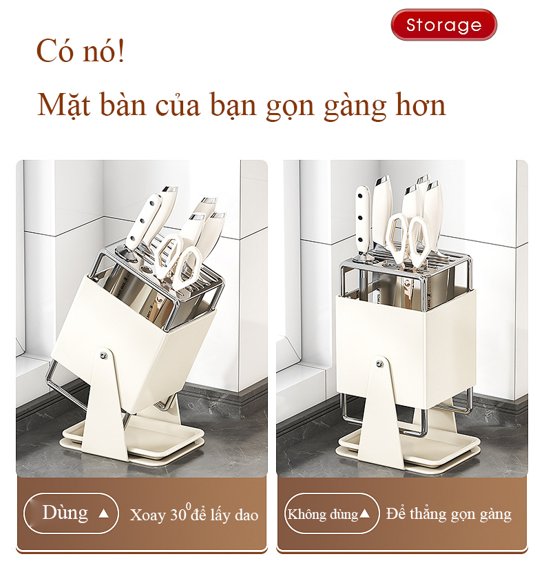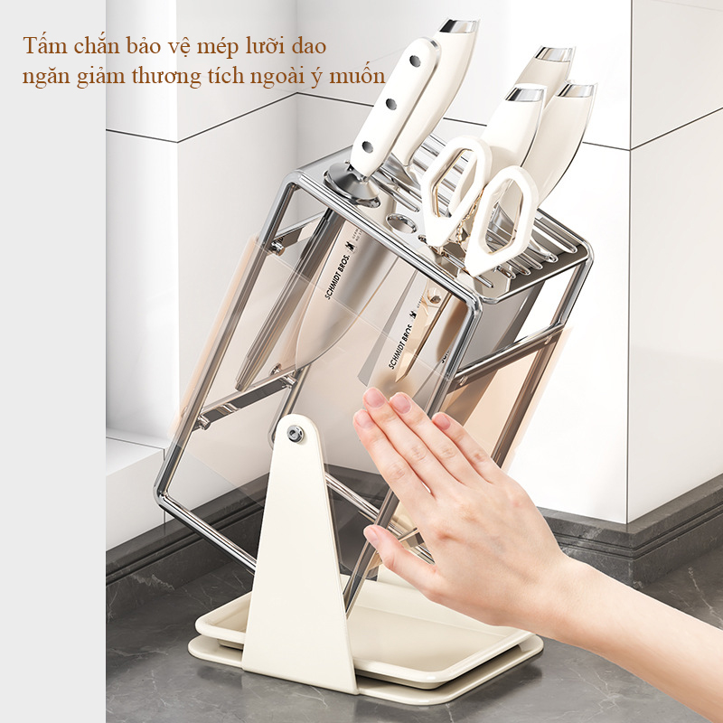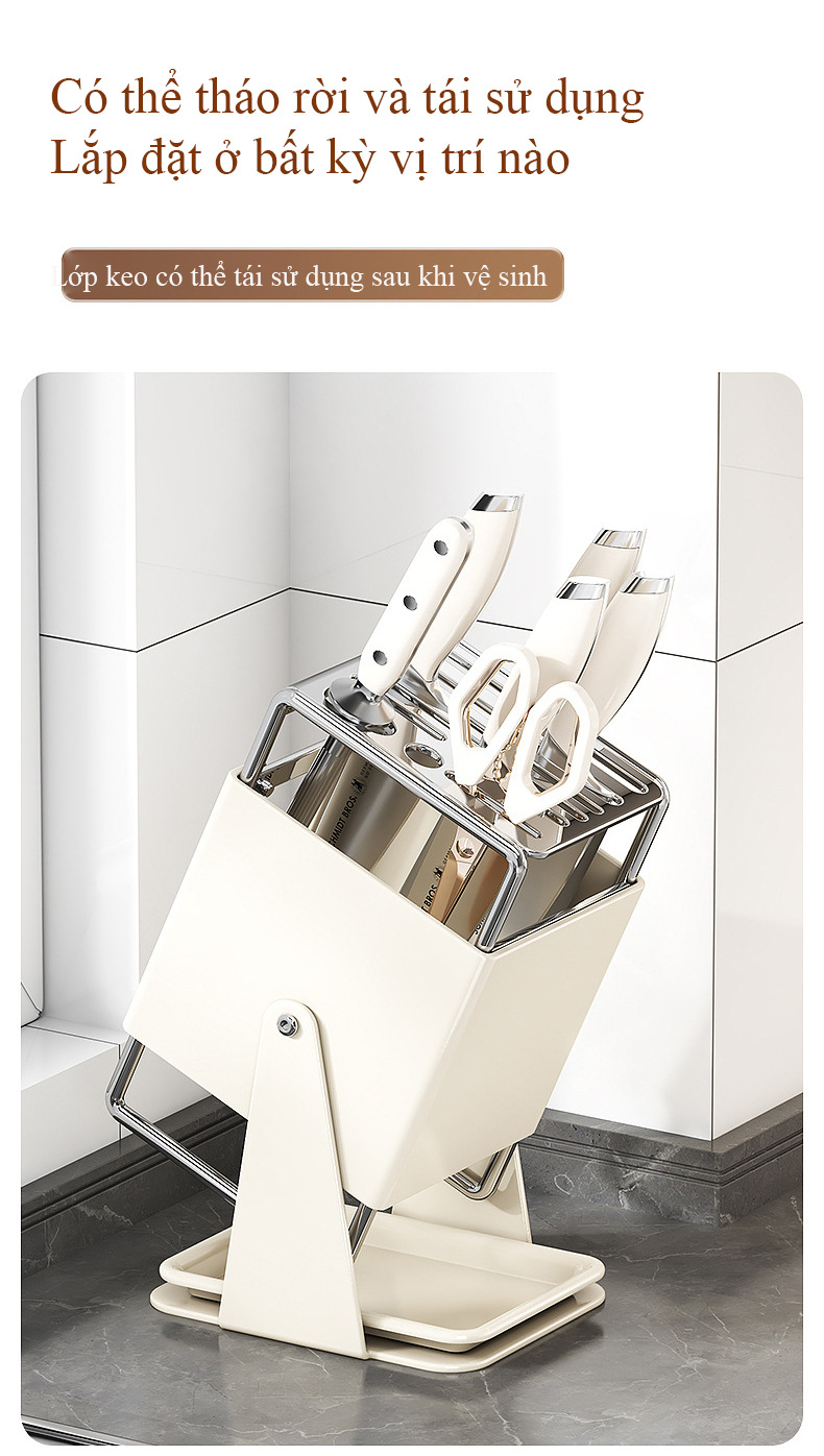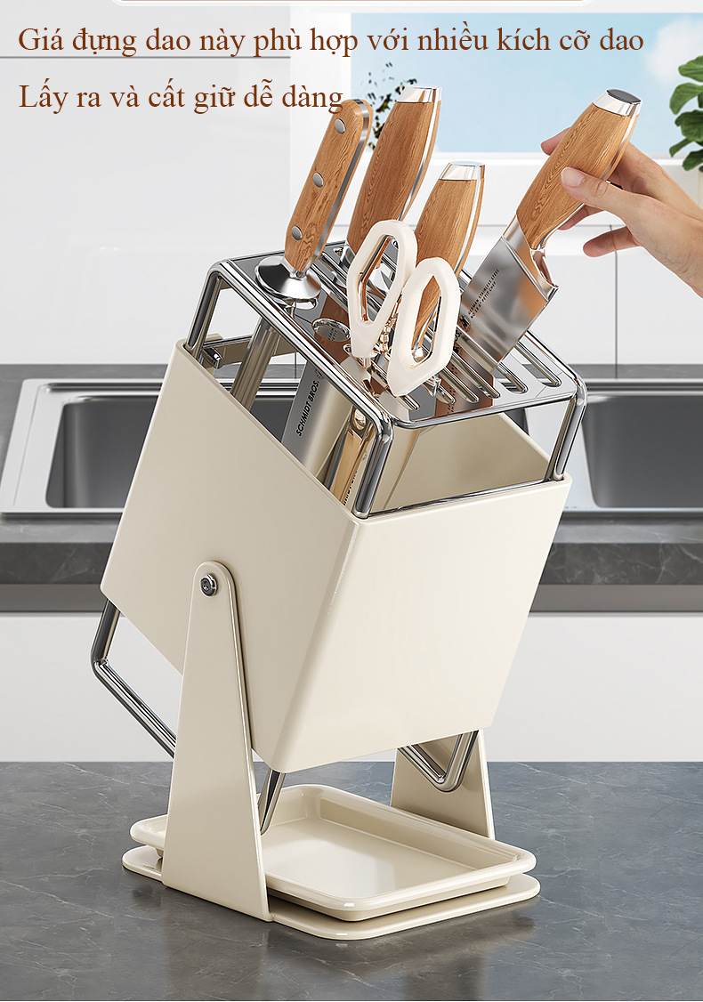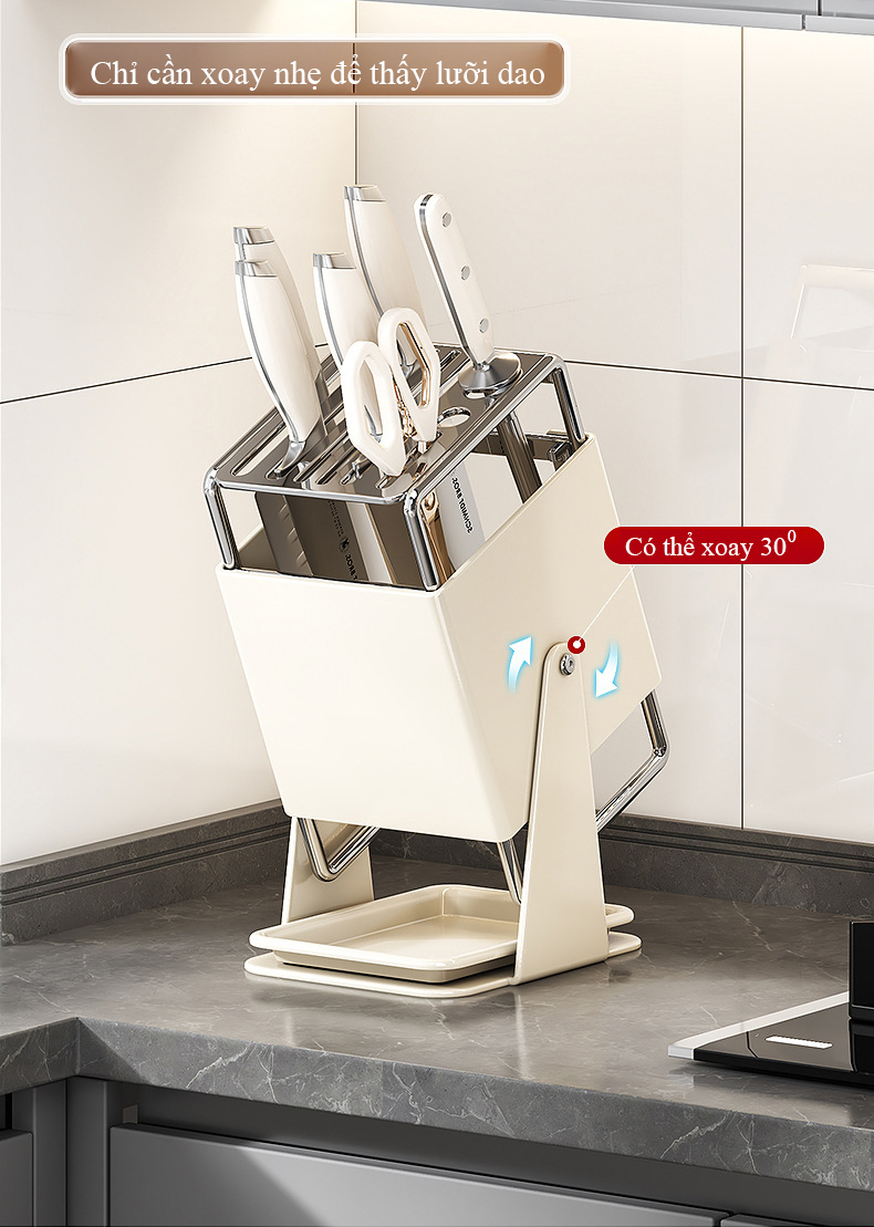 Giá đỡ dao nhà bếp bằng thép không gỉ xoay 30 độ kiểu để bàn có khay thoát nước, phù hợp sắp xếp dao gọn gàng hơn trong khu bếp.