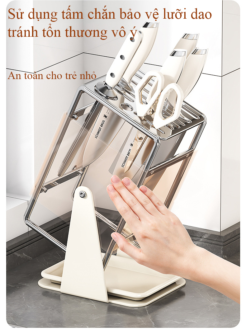 - Tấm chắn phía trước che bớt mép lưỡi dao lộ ra, giúp khu để dao gọn mắt hơn.
