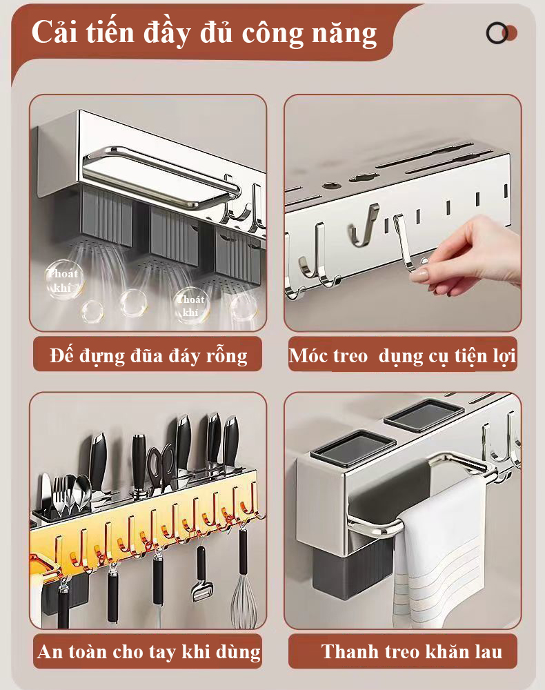 Tích hợp thanh treo khăn lau và chỗ để đũa hoặc thìa, giúp tối ưu không gian trong một cụm treo duy nhất.