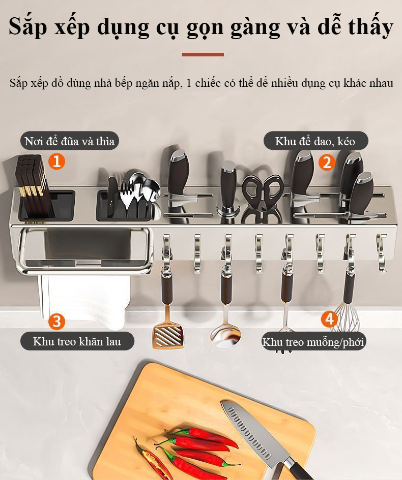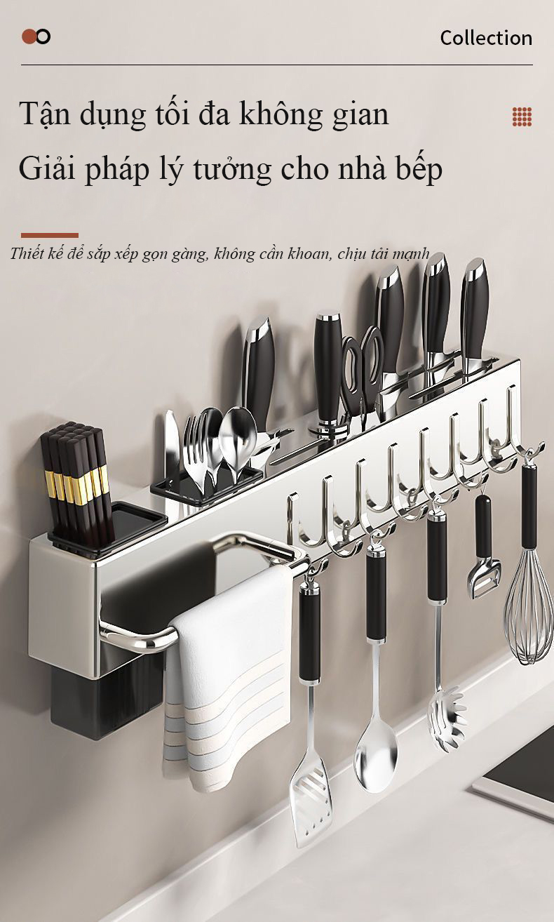 Bếp hay bị rối khi dao, kéo, vá, đũa và khăn lau nằm rải rác ở nhiều chỗ. Mẫu giá đỡ này giúp gom các món dùng thường xuyên về một vị trí treo tường gọn mắt hơn, dễ lấy hơn và bớt chiếm diện tích mặt bếp. Kiểu lắp không cần khoan cũng phù hợp với nhu cầu muốn sắp xếp lại bếp mà không muốn đục tường.