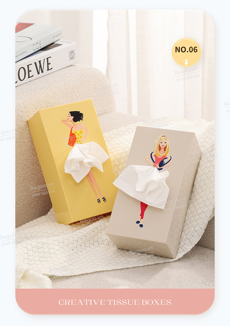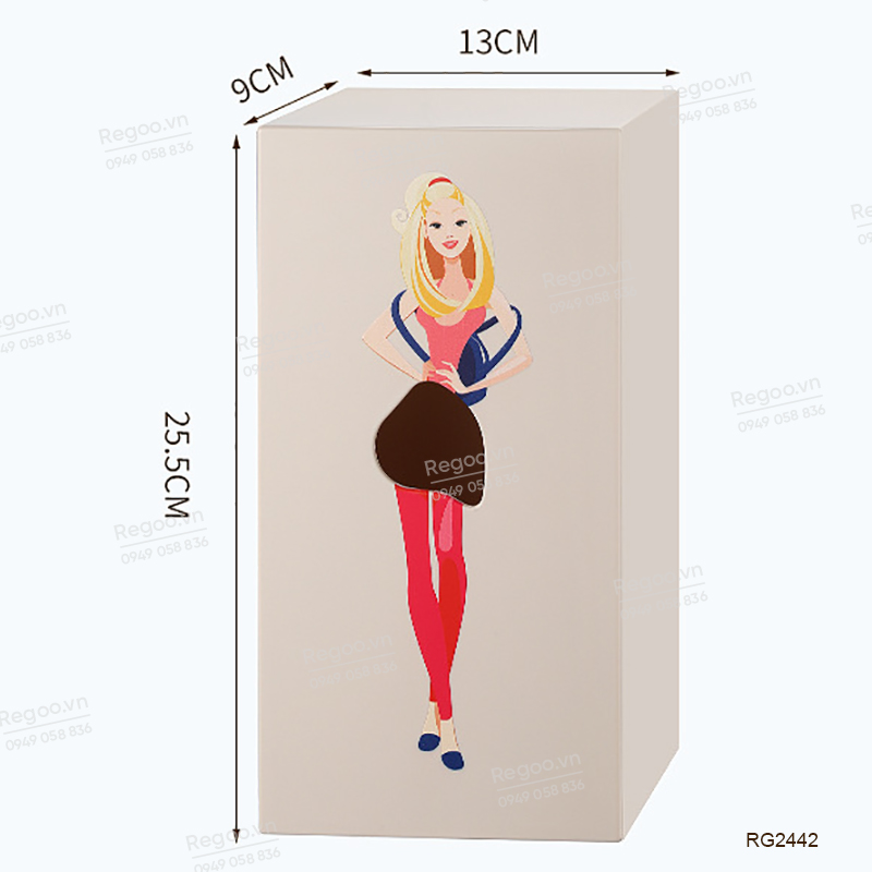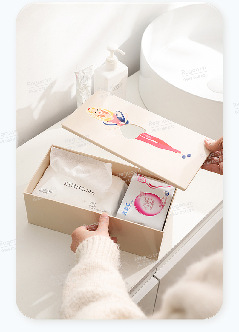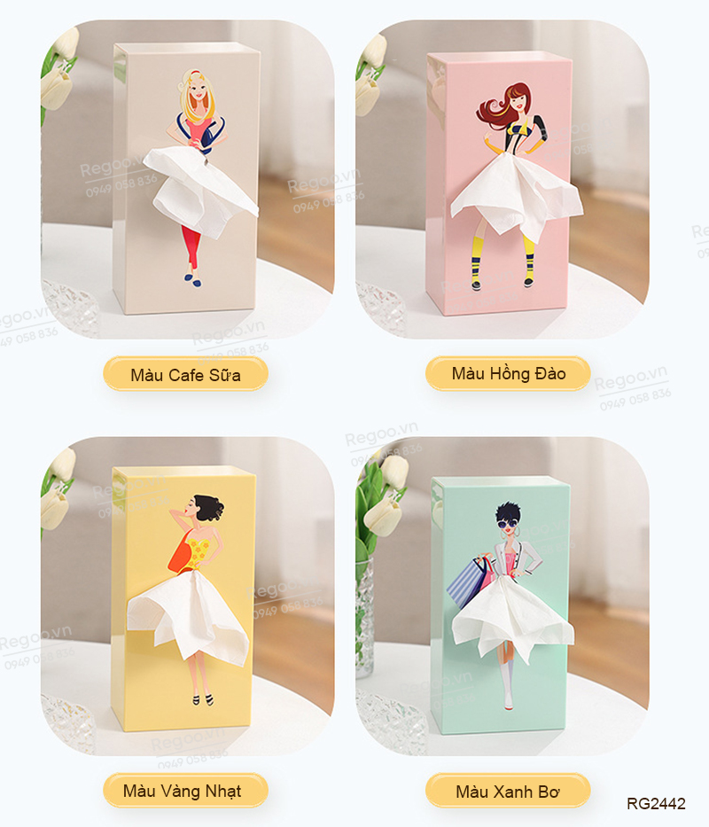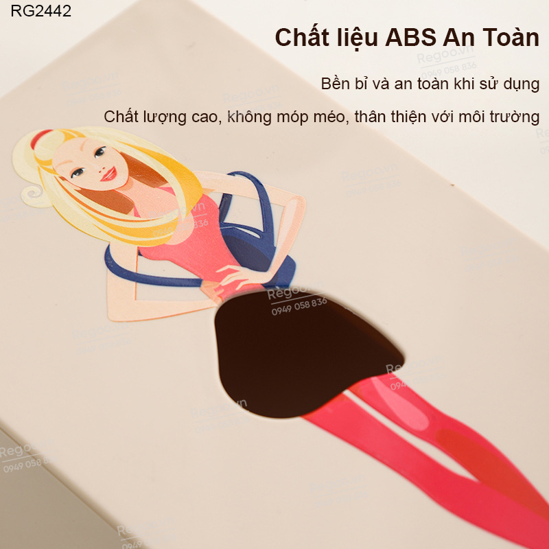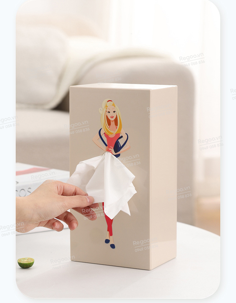 Hộp đựng khăn giấy RG2442 là mẫu hộp rút giấy để bàn có họa tiết cô gái thanh lịch, phù hợp dùng trong phòng khách, bàn ăn, bàn làm việc, quầy cafe hoặc văn phòng.