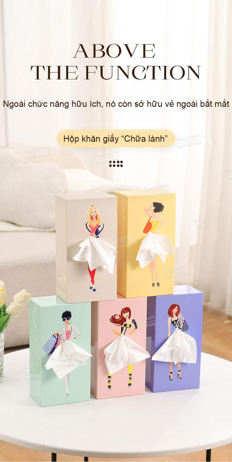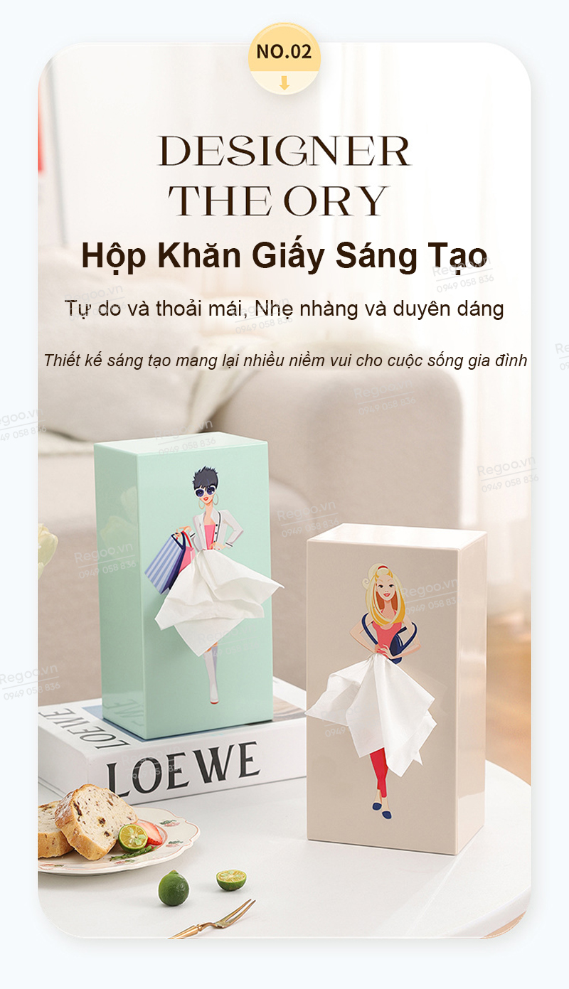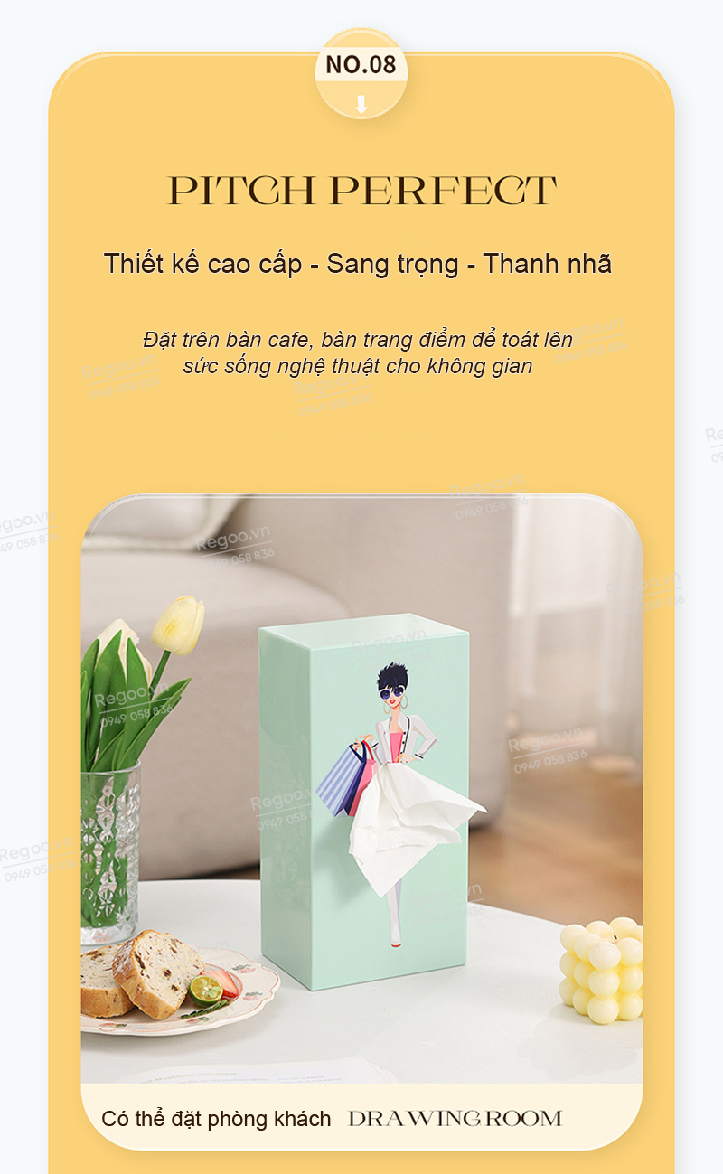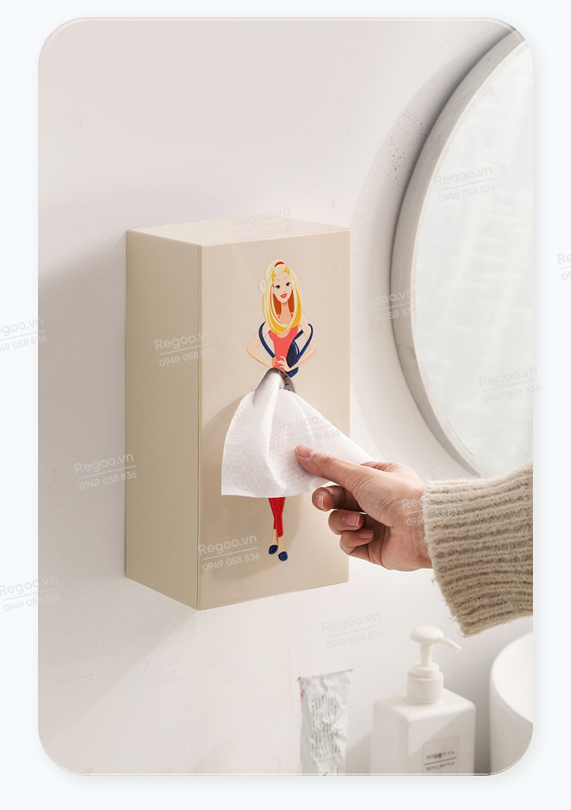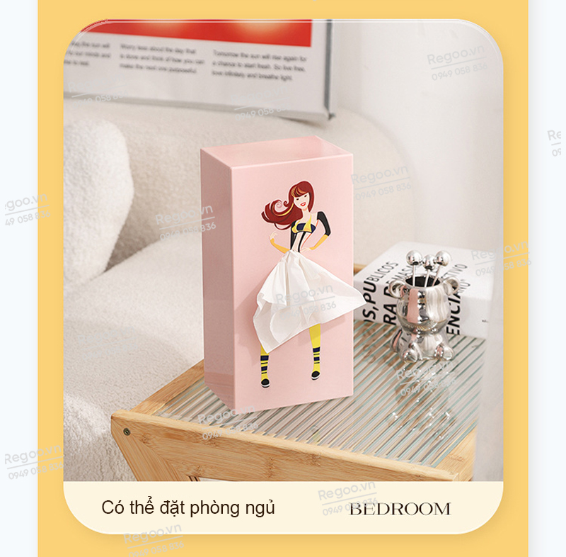 Hộp đựng khăn giấy RG2442 là mẫu hộp rút giấy để bàn có họa tiết cô gái thanh lịch, phù hợp dùng trong phòng khách, bàn ăn, bàn làm việc, quầy cafe hoặc văn phòng.