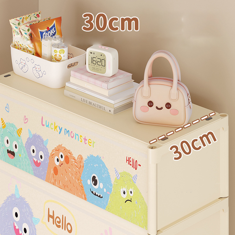- Họa tiết hoạt hình tông sáng, giúp tổng thể không gian nhìn mềm mại và bớt khô cứng hơn so với kệ mở thông thường.