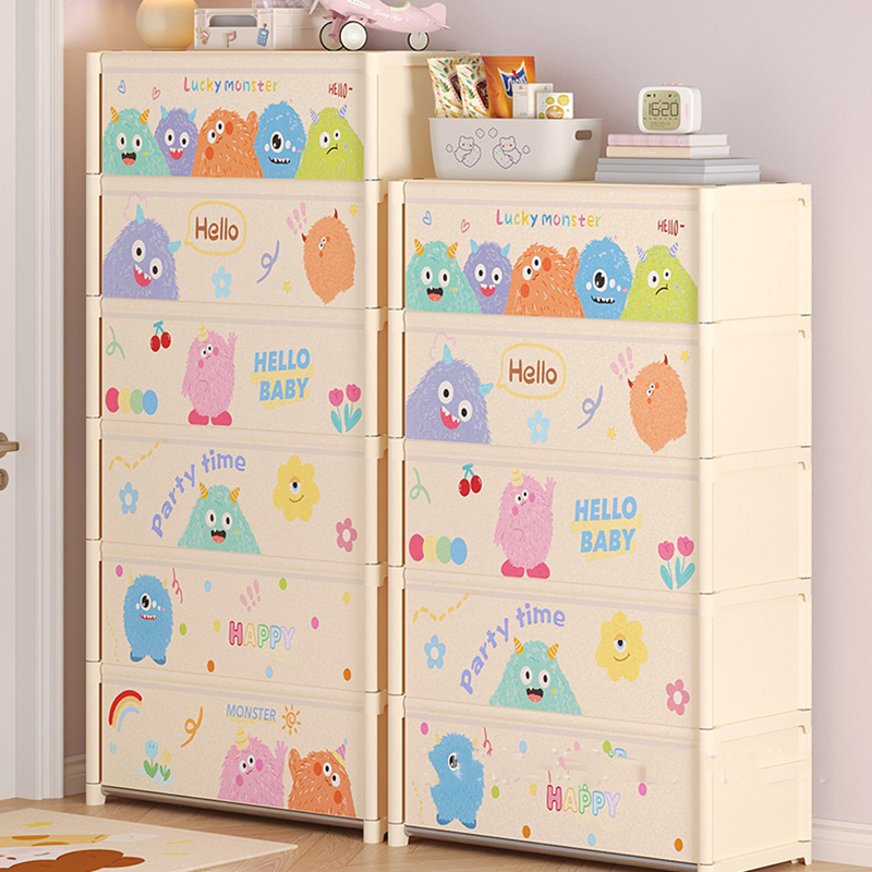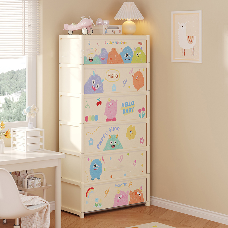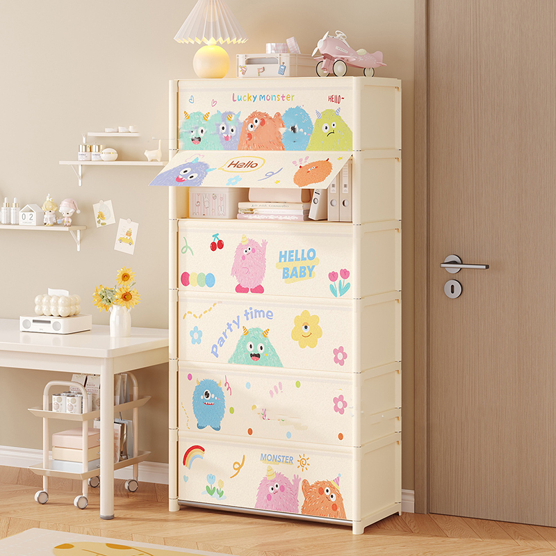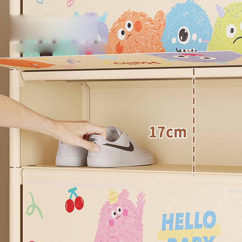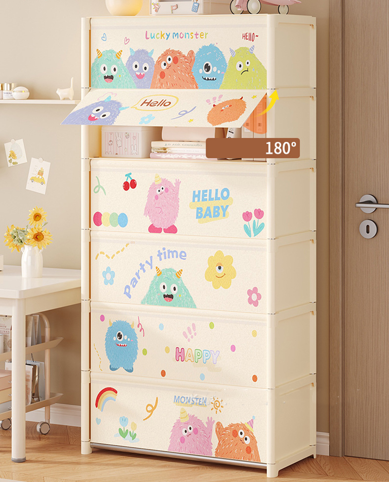 - Họa tiết hoạt hình tông sáng, giúp tổng thể không gian nhìn mềm mại và bớt khô cứng hơn so với kệ mở thông thường.